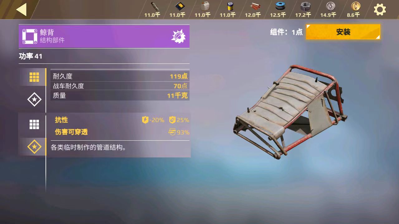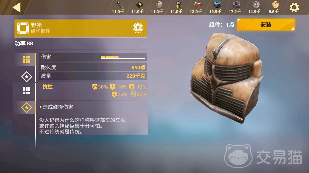 第2项撞击板,在抗性界面中具有造成碰撞伤害的部件,这种部件并没有战车耐久度的属性,因此无法提升载具的耐久度,但是在一般情况下,这些部件自身的耐久度和伤害抗性都非常优秀,还能在撞击时候提供一定的伤害加成。例如小编下图所提供的野猪,就是很出色的撞击板,它是载具的车头,撞击的时候能够造成更多伤害,自身也非常耐撞。