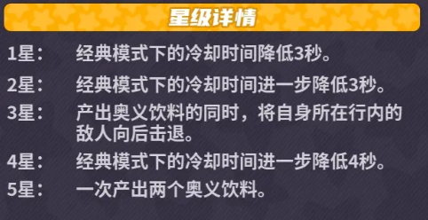 薇薇恩可可乐有着五层星级可以提升。一星时,在经典模式下可以减少三秒的冷却时间;二星时,冷却时间再次减少三秒;三星时,在奥义饮料产出时,可以将同行内的敌人击退;四星时,冷却时间再次减少四秒;五星时,可以同时产出两个奥义饮料。