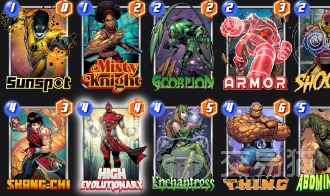 比较适合他的卡组是白板卡低能耗组,在角色的搭配上建议使用迷雾骑士、蝎子、震撼者等等白板卡牌,并且这些白板卡最好是初始就拥有较高的攻击力,例如浩克,浩克初始就拥有12点的基础攻击力,一旦它被赋予了新的特效技能,例如减少能量消耗或者是增加基础攻击倍率,那么它的战斗力会直接进阶。
