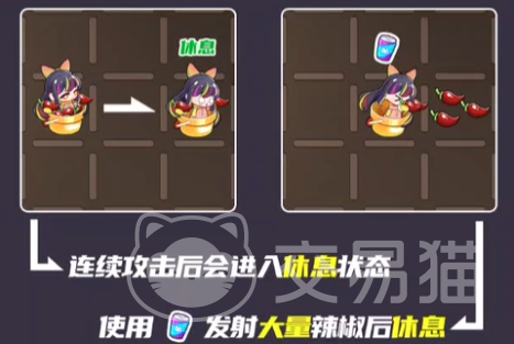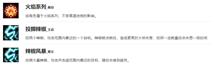 椒椒射手的被动技能可以不收高温地板的影响,她的主动技能可以一次投放两个辣椒攻击敌人,而且如果辣椒被点燃的话,还可以造成更高的伤害。而她的奥义技能则是可以一次性投放大量的辣椒,并且还可以把最近的敌方单位击退一定的距离。