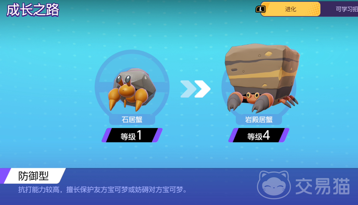 岩殿居蟹的坦度非常高,它是属于近距离攻击的宝可梦,拥有很强的防御能力,非常抗打,移动速度也是很快,基础伤害倍率虽然不是特别好,但是有着十分有效的群攻能力,它能够对前方的区域发射岩石,并且对敌人造成眩晕伤害,在岩殿居蟹达到六级之后,它可以进化成为能够发出远程攻击技能的宝可梦,它能够通过破壳将自己基础的防御外壳丢至敌人的目标圈中,并且防御外壳会主动攻击敌人。