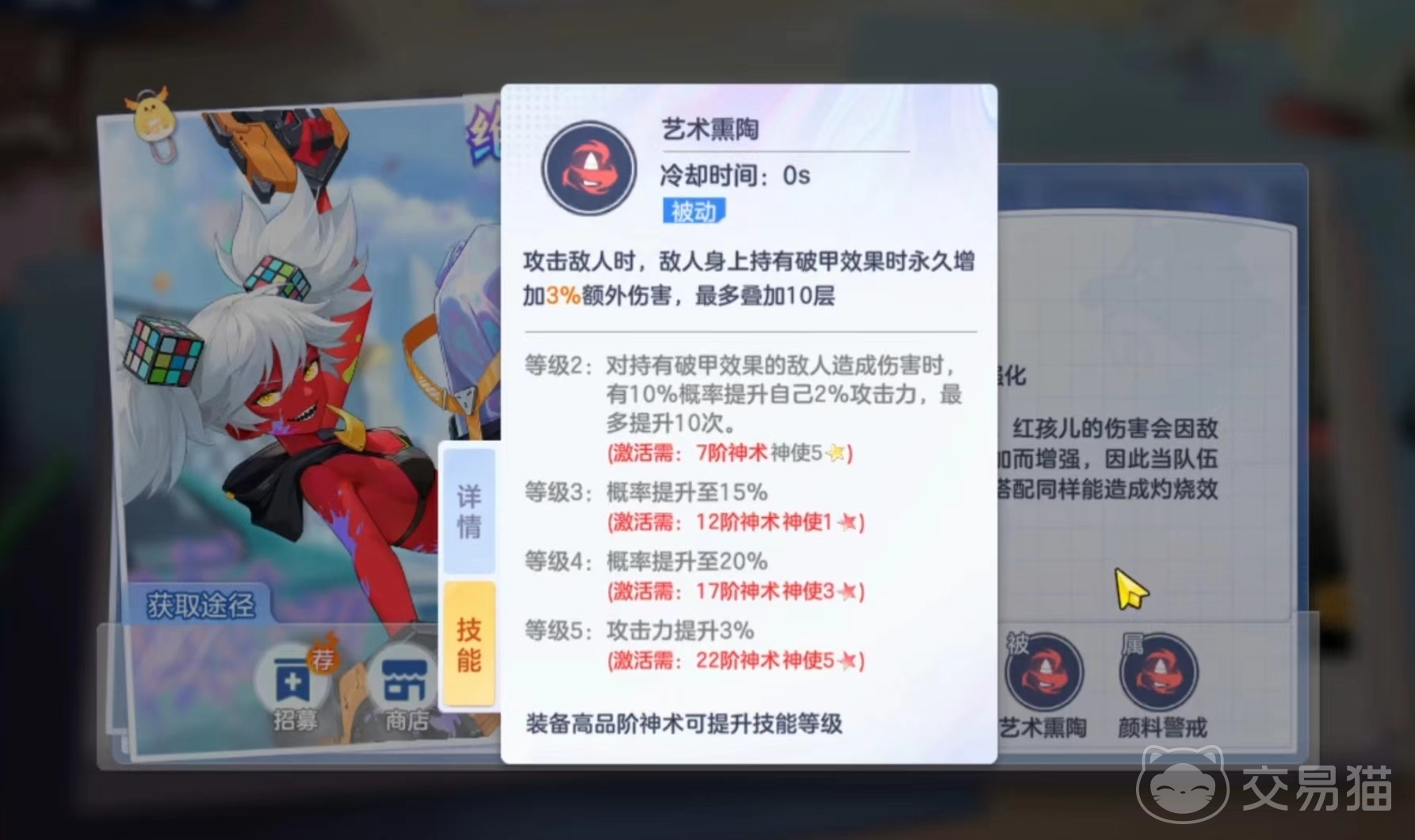 被动技能则是艺术熏陶,触发到这个技能的时候,如果敌人身上有破甲效果的话,那么敌方所受到的伤害将会提升3%,并且这个伤害还可以持续叠加,在团队中,作为一个射手的角色,可以增强敌人所受到的伤害,如果搭配一个能够造成灼烧效果的角色的话,两者配合起来,发挥出来的作用会更好。