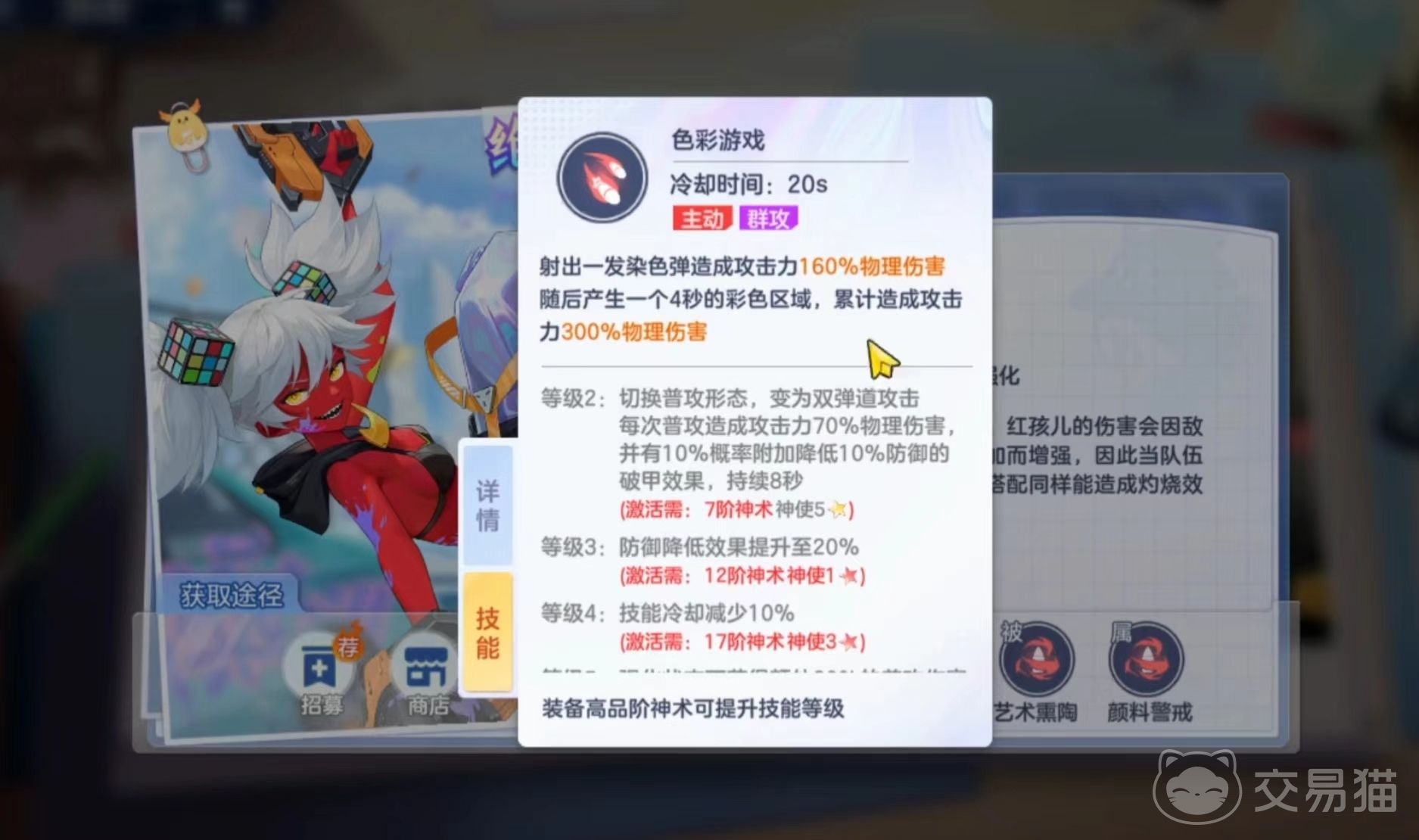 他的觉醒技能是惩罚涂鸦,触发到这个技能就可以向前方进行扫射,能够造成的伤害达到了420%,并且会有一半的概率能将敌方的破甲防御效果降低,这技能时间会持续八秒钟,还有一个主动技能是色彩游戏,当使用这个技能的时候,就可以触发蓝色弹,从而对敌人造成160%的伤害。