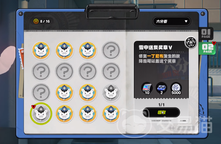 雪中送炭奖章在游戏里可以抽取或者培养角色,而且证明了玩家完成了当前的游戏进度,想收集的话,玩家就可以去往六分街,来到这里之后可以看到一只穿着白色猫咪玩偶服装的角色,角色身前挂着一个形象大使的徽章,通过和这个角色对话,玩家能看到自己现在手里所拥有以及所没有的徽章,其中一个就是雪中送炭。