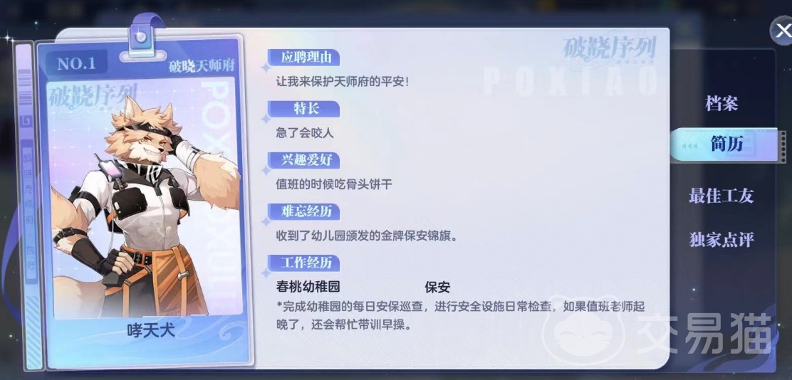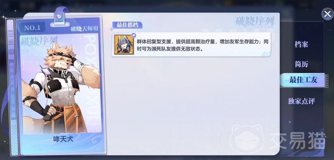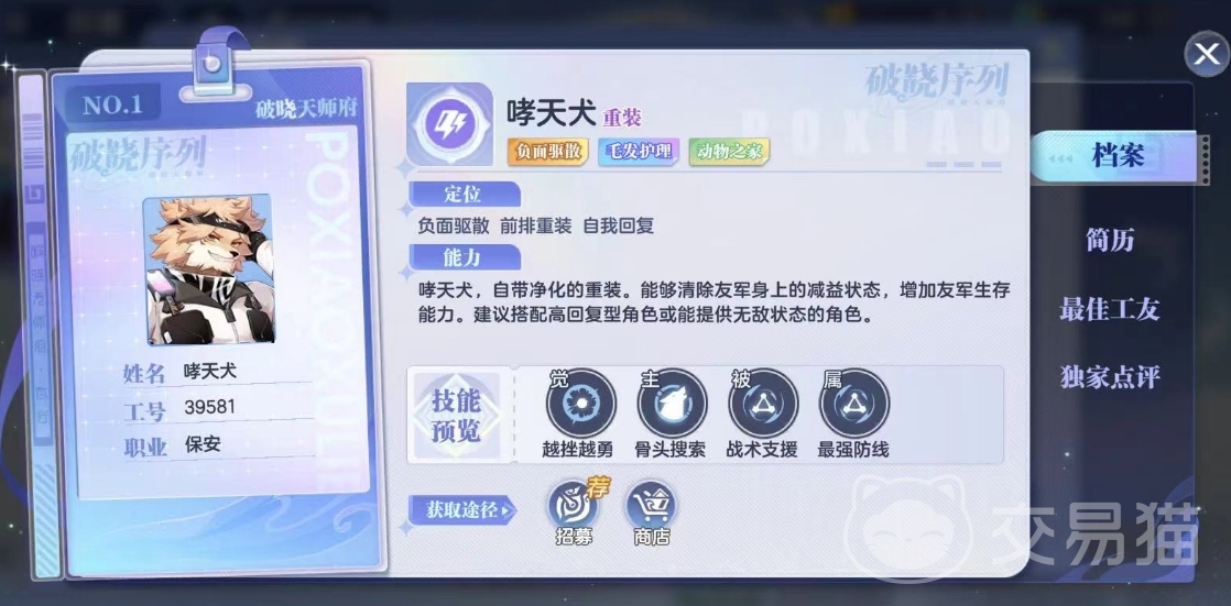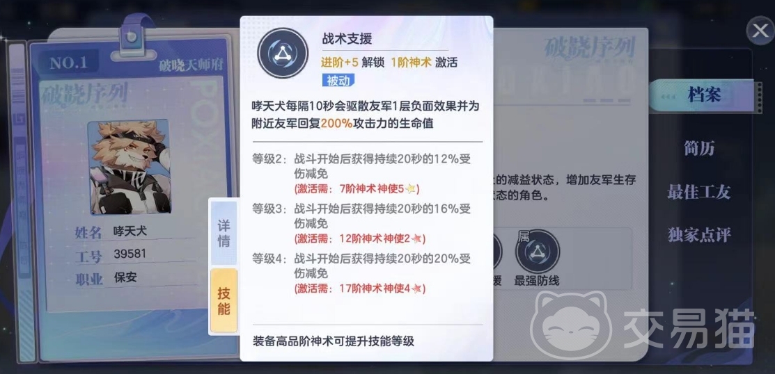 以上就是对破晓序列哮天犬有哪些技能的内容介绍。从角色技能效果来看,哮天犬的定位还是很清晰的,就是一名辅助,可以给队友上buff,回血,削弱敌人防御。抽到他的朋友可以培养游玩下,将他放在前排抗伤害,加buff,游戏体验还是很不错的。