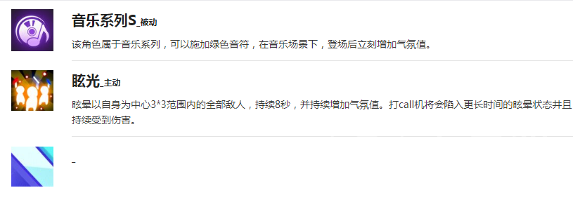 这是一个属于音乐系列的角色,一旦在获取之后就能得到绿色音符,在音乐场景下,一旦在登场之后就能迅速的提升气氛值。