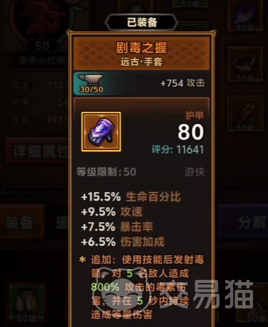 选择合适的毕业装备,可以有效的增加大家的战斗能力,更好的进行打怪和通关,玩家们可以选择剧毒之握这个手套,作为一款远古的手套,它拥有754的攻击力,伤害是非常高的,并且等级的限制在50级,可以增强自己生命的15.5%,还可以提升,9.5%的攻速以及7.5%的暴击率,6.5%的伤害加成。