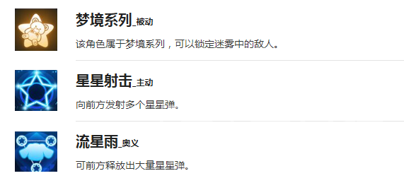 这一个角色就属于梦境系列的其中一个,一旦在遇到敌人时,就可以把敌人全部都锁定在迷雾中,没有办法逃脱。星星射击属于一个主动技能,在释放之后就可以朝着前方发射多个星星弹。流星雨_奥义一旦朝着前方释放之后,那就会形成大量的星星弹拥有比较可怕的实力。