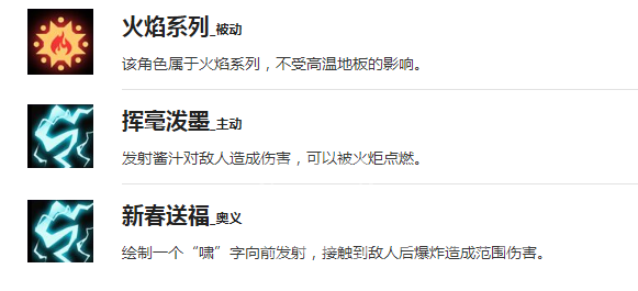 挥毫泼墨:在发射酱汁之后,就可以给沿途的敌人造成伤害,而且可以马上点燃火炬。新春送福:是一个非常不错的奥义技能,可以直接绘制出一个字,朝着前方发射,一旦敌人在接触之后,立马就可以形成爆炸性的范围伤害。
