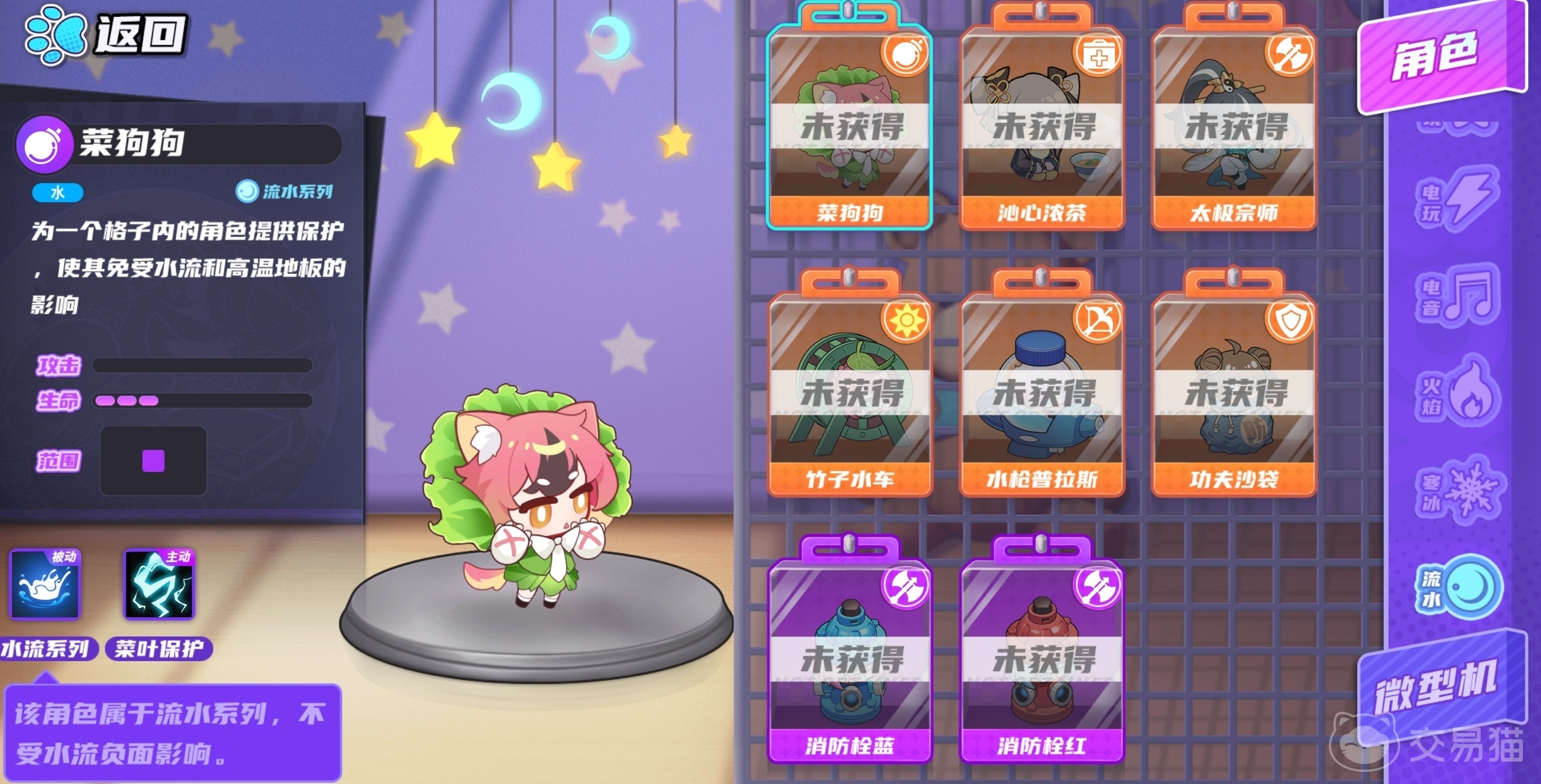 作为流水系列的菜狗狗在水系地图上会展现出别样的优势,菜狗狗在这样的地图上时不会受到地图水流带来的负面影响。菜狗狗的主输出的技能“菜叶2保护”会召唤一片超大的菜叶保护周围一格内的己方,其中要注意的时菜狗狗的主动技能无法防御范围伤害和指定攻击,但可以保护己方不受到水流和高温地板的负面影响。