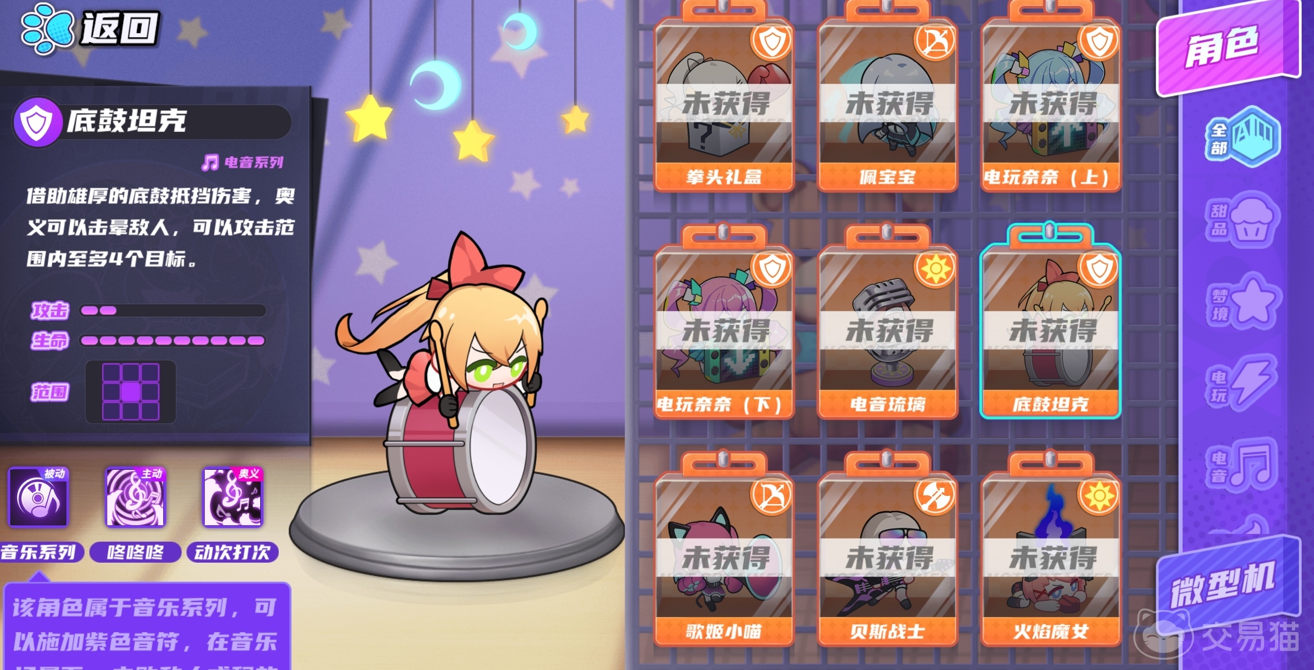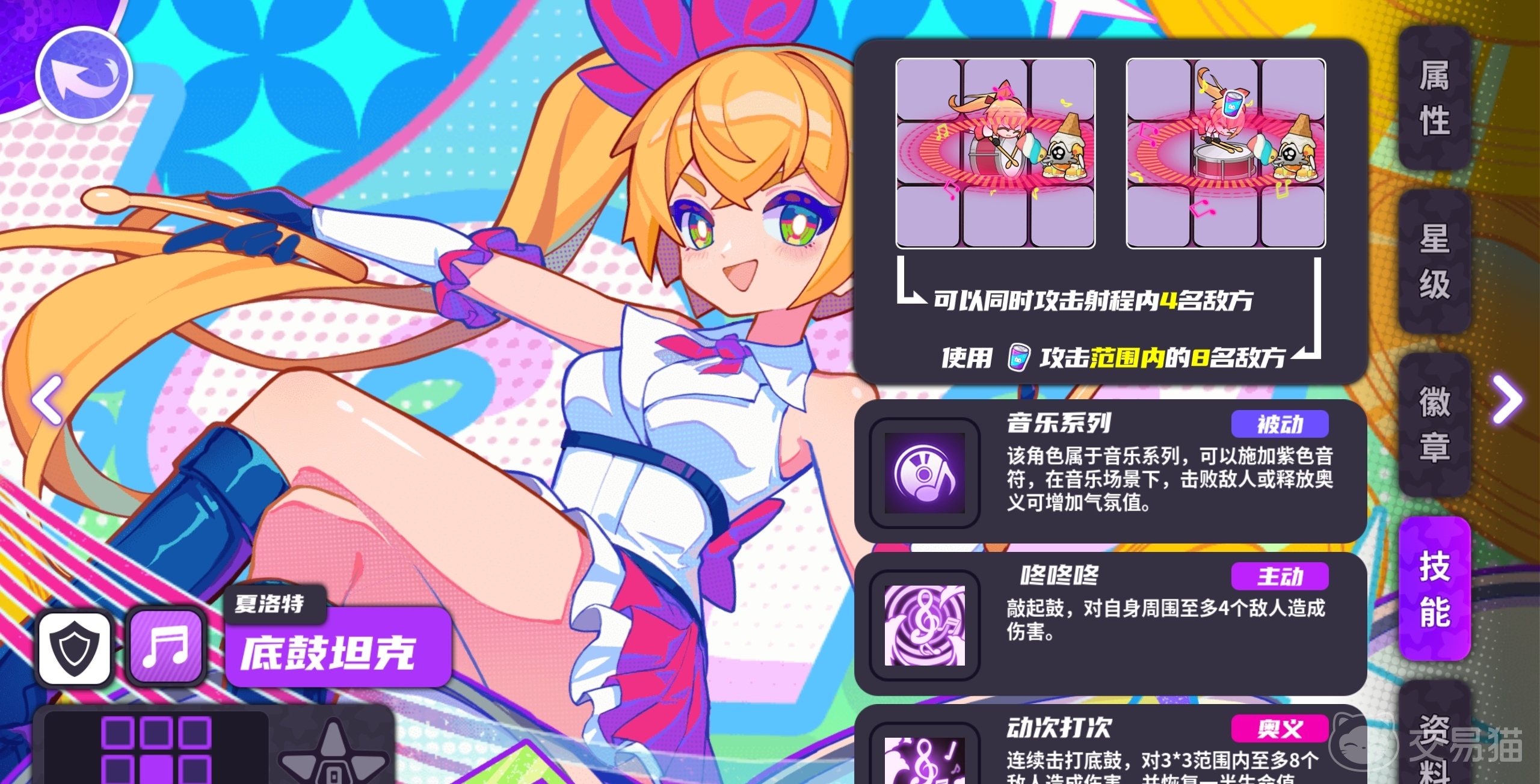底鼓坦克作为音乐系列角色,其被动技能可以在场上发出紫色音符,如果有音乐场景的加持下,底鼓坦克在击败敌人或释放奥义后可增加气氛值。作为主输出的主动技能,底鼓坦克将敲击架子鼓对自身周围至多4个敌人造成一定伤害。底鼓坦克释放奥义时底鼓坦克会连续击打架子鼓,对3*3范围内至多8个敌人造一定成伤害,同时恢复一半生命值,如果气氛达到上限,将直接回满生命值。