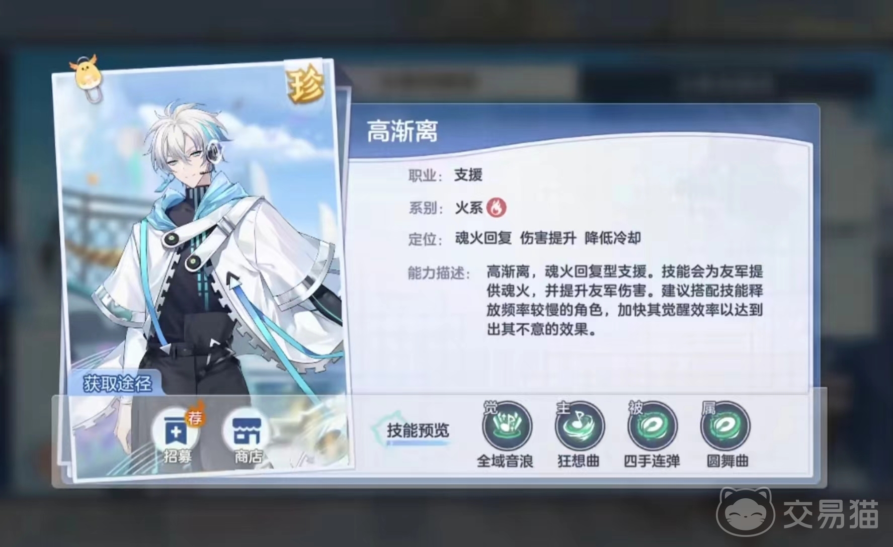 高渐离在游戏里面可以算是一个支援型的角色,使用技能的时候就能够为队友提供能量,而且还能提供伤害,只不过在提供伤害的时候会消耗自己的生命值,所以建议大家可以搭配提升觉醒效率的角色,这样就能在关键时刻触发技能来回复生命值。
