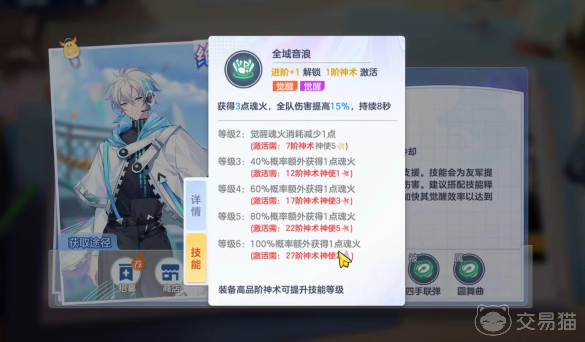 他的觉醒技能是全域音浪,使用这个技能就能让自身得到三点魂火,并且可以将整个团队的伤害提升15%,效果将会持续八秒钟的时间,还有一个主动技能是狂想曲,使用这个技能就可以在战斗的时候,通过放弃自身的5%生命值,从而去得到一点魂火。