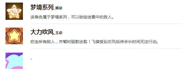 属于梦境系列的其中一个,能有效锁定迷雾中的敌人。大力吹风是一个主动技能,可以一下子吹走所有的敌人,暂时还可以达到驱散迷雾的作用。飞碟在受到吹风之后,这就意味着较长的一段时间内都没有办法正常的行动。