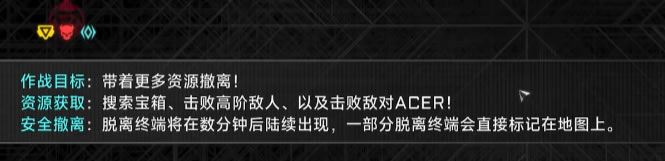 进入战场后,注意玩法的提示。核心作战目标是带着更多资源撤离!而不是击败其他玩家。如果撤离的目标无法达成,在其中获得再多的资源都无济于事。而击败精英敌人、Boss和其他敌对Acer都是为了获得资源的,但你要衡量自身实力,千万不要贸然开启挑衅大佬。其实大佬只对Boss感兴趣,也只拿金色资源,可能紫色都遗弃在地上留给你捡。