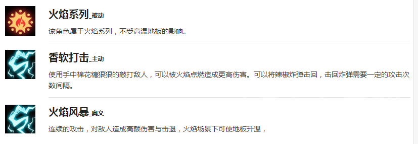这属于一个火焰系列的角色,并不会受到高温地板所产生的影响,拥有两种技能,香软打击是主动技能,可以直接用手中的棉花糖,然后去敲击敌人,一下子就能造成较高的伤害,此时还可以用辣椒炸弹回击。火焰风暴是奥义技能,一旦在连续攻击之后就可以给敌人造成比较高的伤害,在火焰场景下还能迅速的提升地板温度。