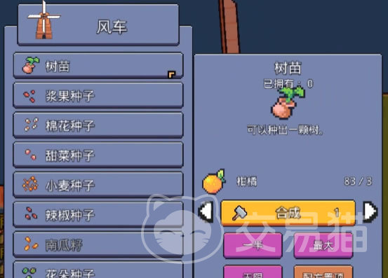 安放好洒水器之后,就要选择种植的品种。但是无论是树苗还是其他作物的种子,都是需要合成出来的,咱总不能直接把一个橘子埋在土里吧?之前采集得到的水果、坚果等农作物此时就可以合成为种子和树苗了。比如3个柑橘可以合成一个树苗,好在收获时得到的柑橘会远远大于合成消耗的,否则不是越种越少了?不过小编觉得这个很不合理,难道三个橘子里只有一颗籽吗?好吧,可能成活率太低了。