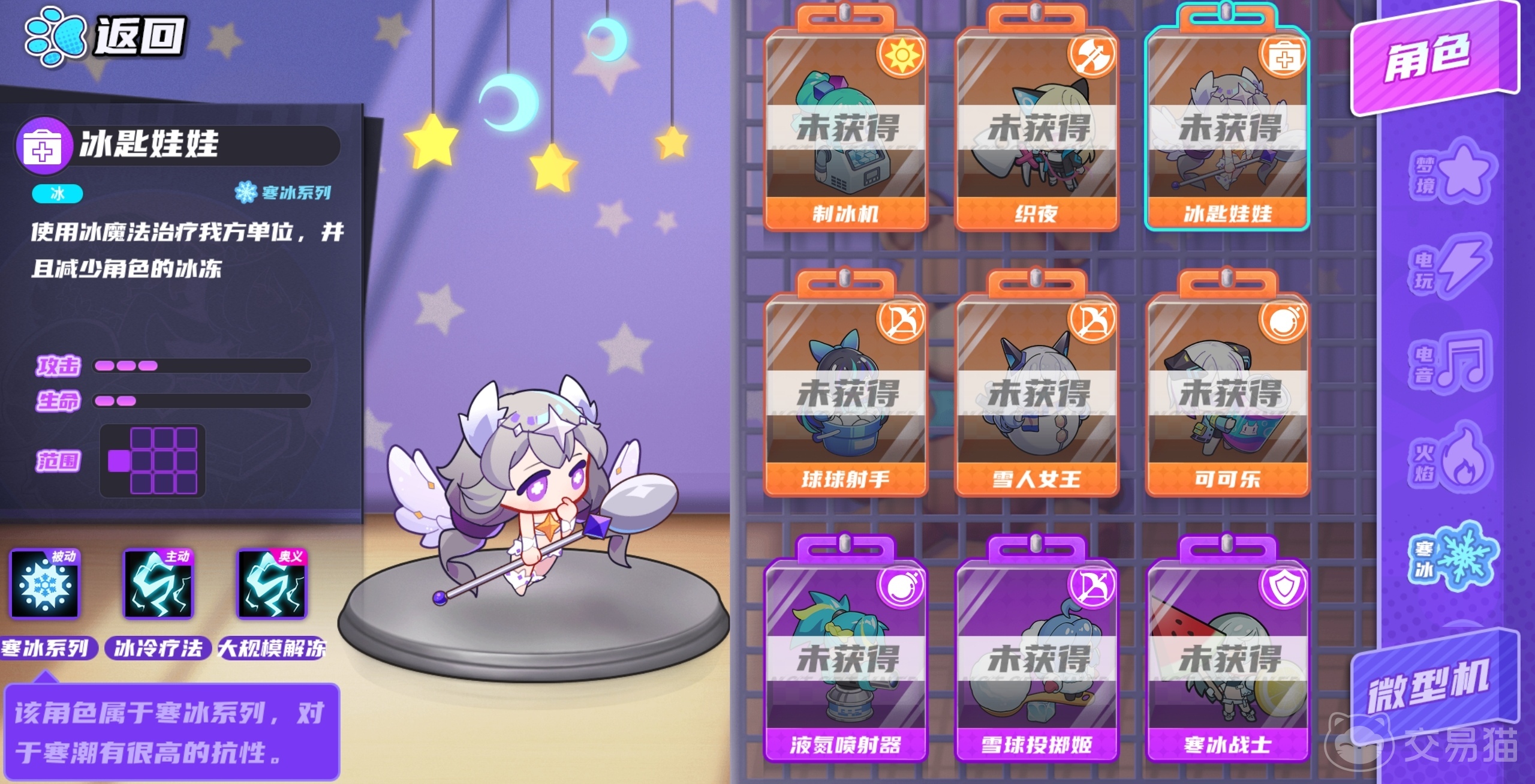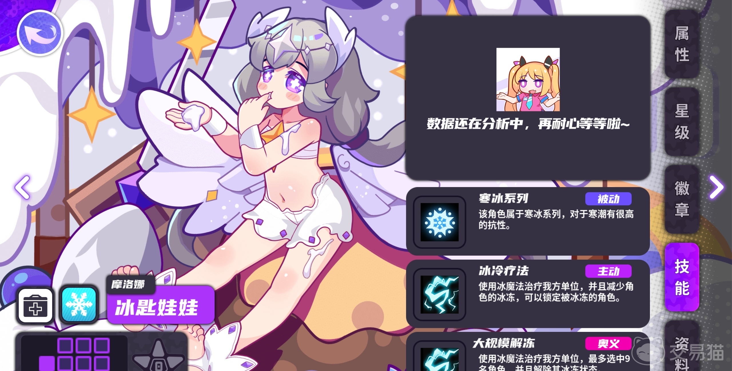 冰匙娃娃因为被奇怪的射线击中,身体和心智都回到了四岁的水品,冰匙娃娃在游戏中是十分强力的辅助角色,能在保护己方安全的同时冰冻敌人干扰敌人进攻。冰匙娃娃一星时会提升基础的治疗量,二星时会使周围角色的寒冷值增加速度降低,在冰匙娃娃三星时会进一步使治疗量提升,在冰匙娃娃四星时对己方减少的寒冷值进一步增加,满星的冰匙娃娃的治疗量将提升至最高水平。