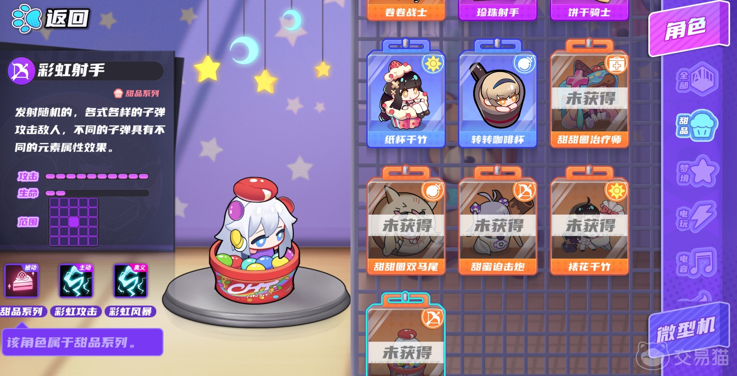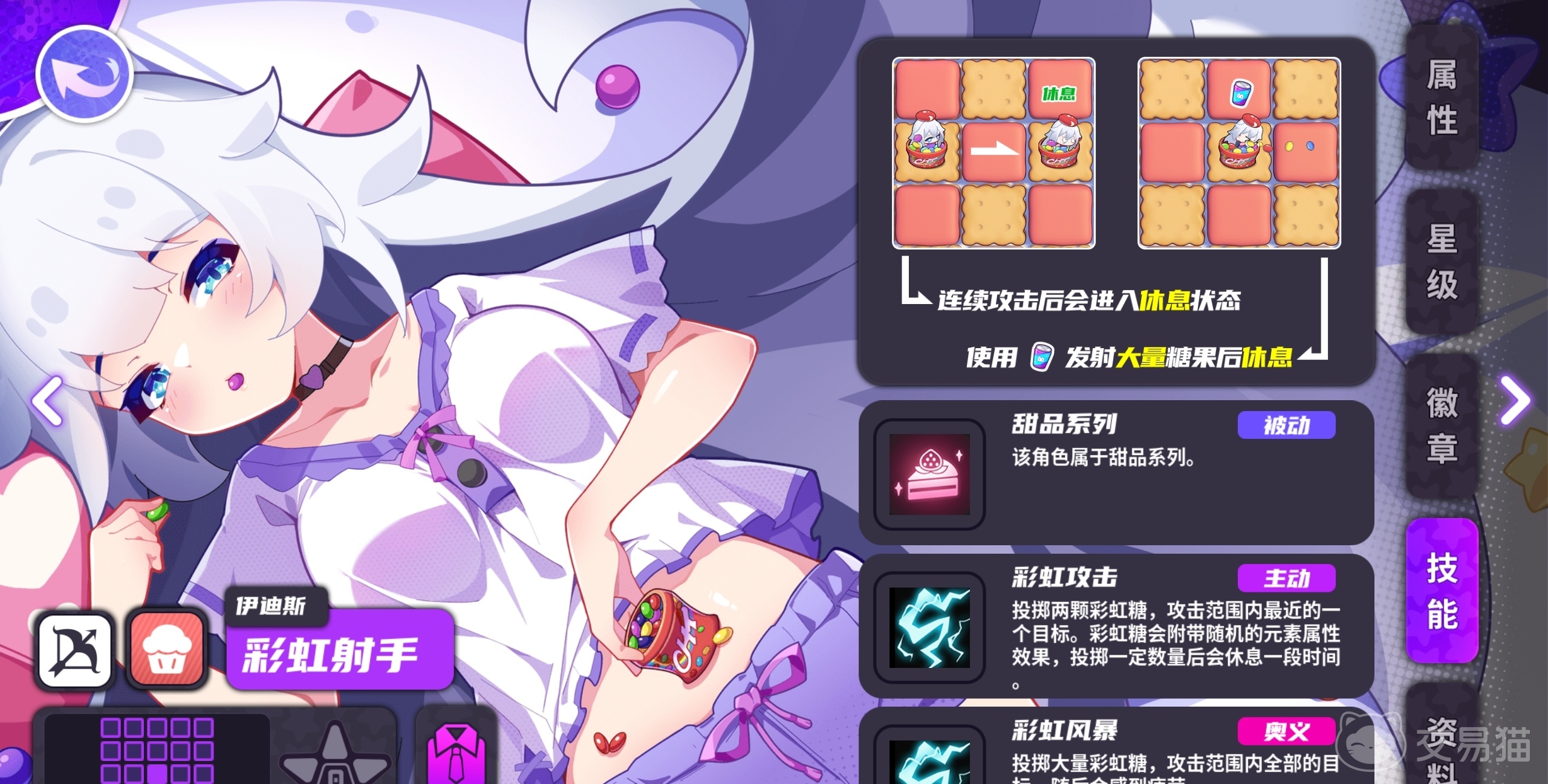 彩虹射手作为游戏中非常可爱的彩虹糖小女孩,在游戏中是十分重要的输出角色,在后排拥有极高的输出,一旦成型将带来强大的输出火力。彩虹射手一星时会对水弱点的敌人优先发射水属性子弹,在其二星时对火弱点的敌人优先发射火属性子弹,彩虹射手三星时对冰弱点的敌人优先发射冰属性子弹,在彩虹射手四星时会大概率对低生命值的队友发射治愈子弹,满星的彩虹射手的子弹将增加更多的穿透属性,并同时加强技能的伤害倍率。