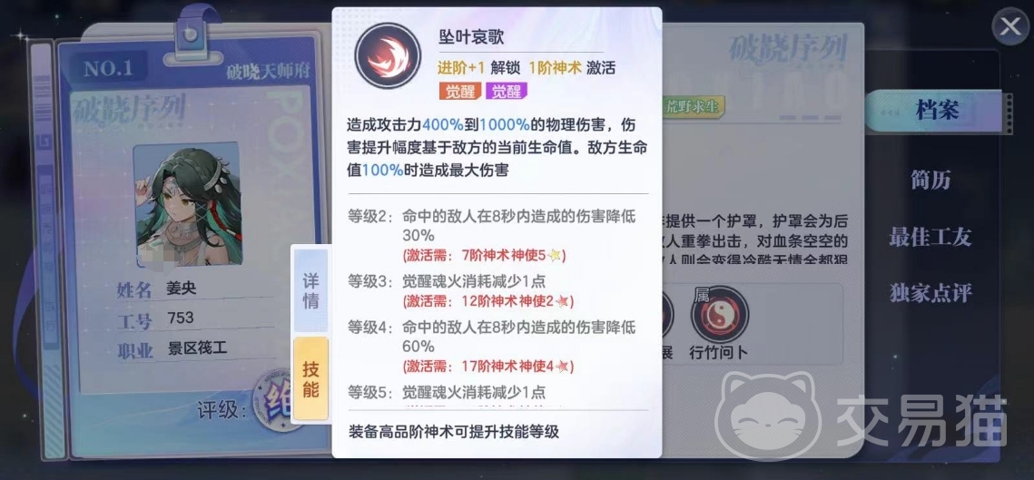 姜央的觉醒技名为坠叶哀歌。这是姜央的核心输出技能,伤害极高。这个技能伤害高的原因就在于它吃的攻击加成多少跟敌人血量有关。如果敌人是满血量的话,这个技能就能吃到最高伤害加成--百分之一千。技能强化以后,还能削弱敌人的输出能力,很不错的技能效果。
