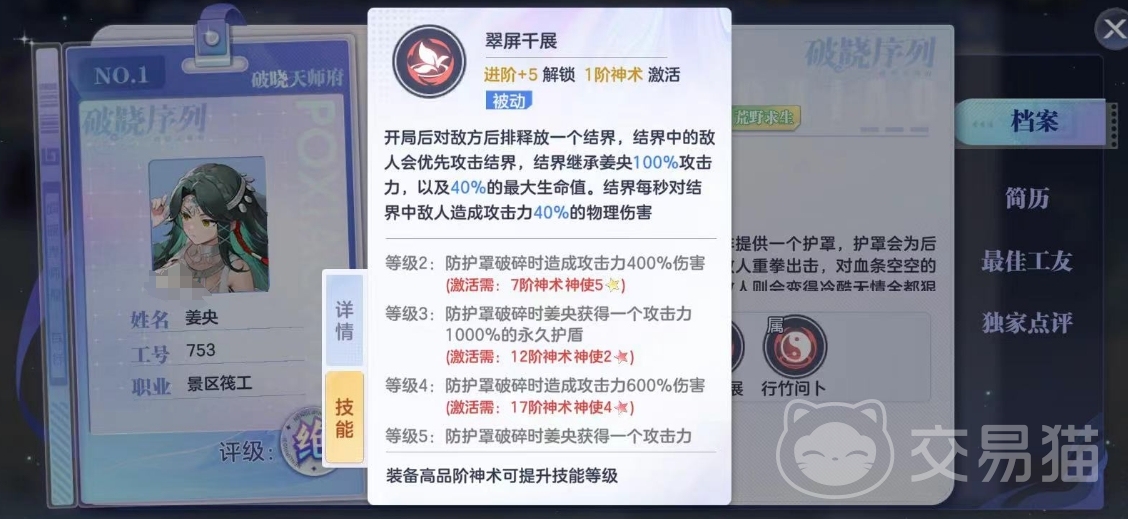 姜央的被动技能名为翠屏干展。这个技能在战斗开始后就可以生效。具体效果是对后排敌人施加一个结界。这个结界具有攻击敌人和阻隔敌人攻击的效果。技能自带的输出伤害可以忽略不计,主要是这个阻隔伤害的能力。这就相当于帮自己的前排队友抗下了一部分伤害,很实用的技能。