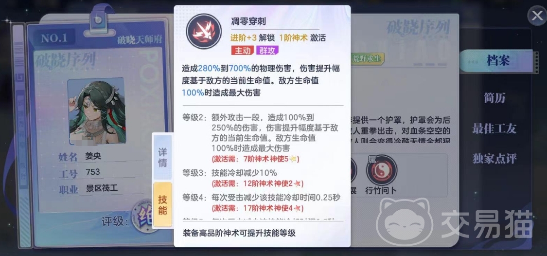 姜央的主动技名为凋零穿刺,也是一个输出技能。这个技能的伤害很可观,最高伤害加成可达百分之七百。并且技能升级后,还能对敌人造成额外攻击,十分强力。