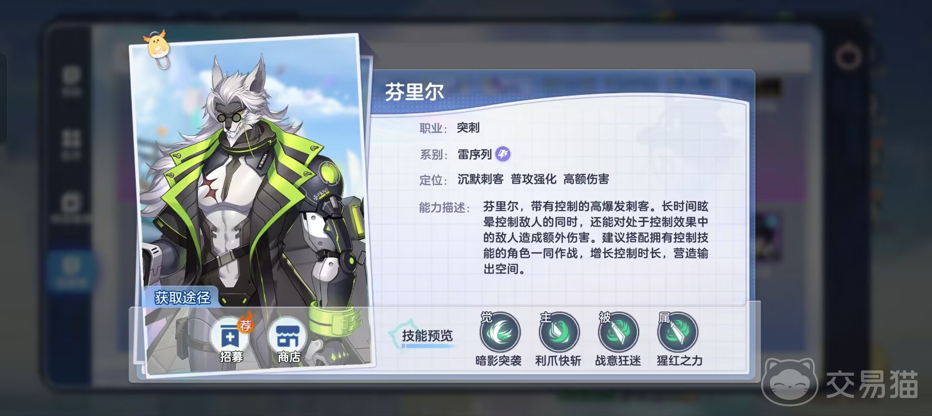 被动技能是战意狂迷,如果使用这个技能,那么在刚开始战斗的时候就有一半的概率能让敌人进入到沉默状态中,如果敌人被控制住的话,就能对这些敌人造成高额伤害,主动技能是利爪快斩,可以用这个技能快速的移动到目标敌人的身边,然后还可以有两秒钟的沉默时间,能够对敌方造成400%的物理攻击伤害。