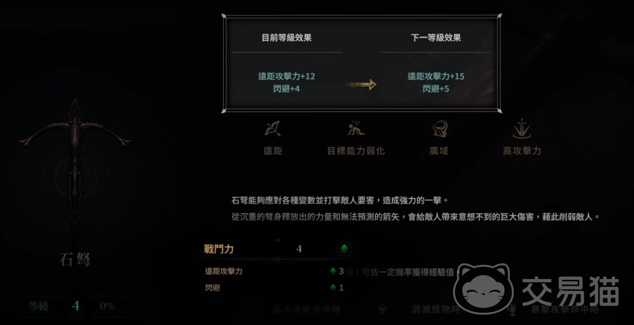 石弩是一种可以蓄力攻击的远程输出武器,有着沉重的弩身。并且距离越远的话,可以造成的伤害就越高。另外还有闪避率,拿着石弩的玩家就能轻松躲避对方的伤害。另外还有着弱化敌人的作用,能够降低目标的防御力。并且攻击范围广,还能造成高额伤害。