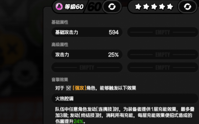 巨星音擎属于a级的一个音擎,如果是基础属性下音擎有40点的攻击力,高级属性下有10%的攻击力,装配的角色如果是强攻类型的,那么在队伍里只要角色使用连携技,那么就能多有一层提升效果,发动终结技之后还会补充玩家消耗的能量,补充之后还可以让对手造成的伤害提升15%,虽然等级不是最高的s级,但是这个音擎绝对是能给玩家带来巨大帮助作用的。