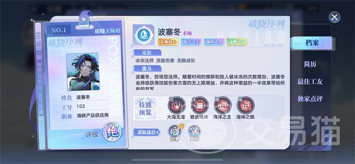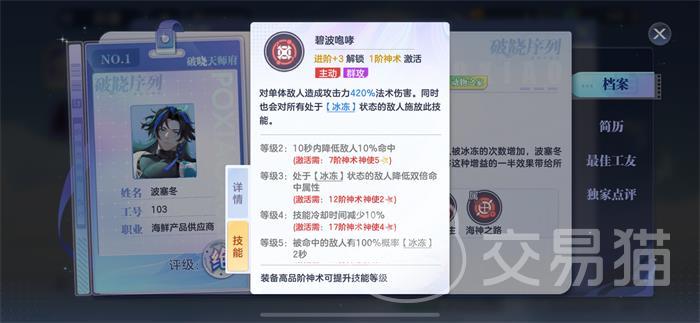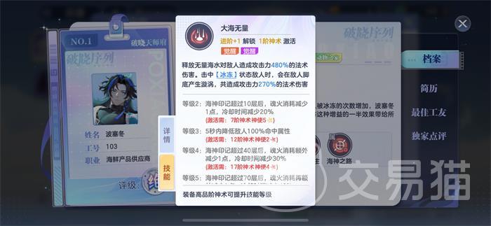 波塞冬在破晓序列中是属于控场型的术士,他的技能都可以造成高额的法术伤害,并且还能够带来无限的增益效果。具体的技能总共有4个,首先觉醒技能是大海无量释放,该技能可以给敌人带来无量的海水攻击,并且附带400%的法术伤害。击中了冰冻状态的敌人时,还会在对方的脚底下产生一个能量漩涡,对他造成额外的180%的法术攻击伤害。