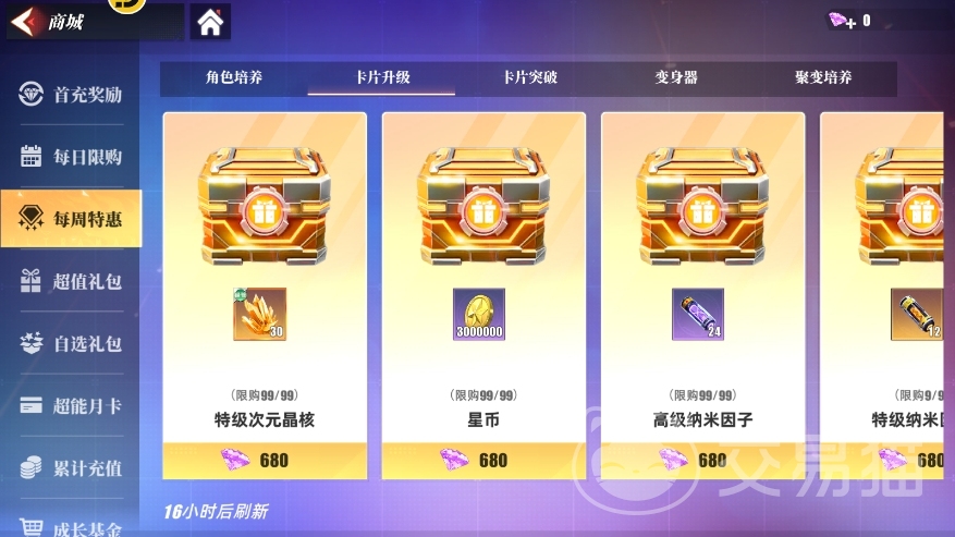卡片升级:其中包含有特技次元晶核礼包,星币礼包、高级纳米因子礼包以及特技纳米因子礼包,这四个礼包的价格都是一样的需要680光源之石,前面三个礼包的限购次数都是99次,只有最后一个特技纳米因子的限购次数是9次,第一个特技次元晶核当中有30个特级晶核,给角色使用可以提供2500点的强化经验,星币礼包中有3000000的星币,这是目前游戏中通用的一个游戏代币,其次是高级纳米因子礼包其中含有24个高级纳米因子,可以对大家已有的卡片进行洗练,最后的特级纳米因子则是可以获取12个,一样是用来给卡片进行洗练的,但是效果比高级的要好很多。