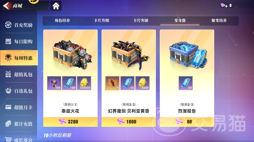 变身器:其中可以花费3280光源之石买一个泰迦火花礼包,这个礼包只能限购一次,其中包含了100张泰迦火花碎片,集齐100张就可以直接解锁这个角色,其次还有100张数据报告,可以用于变身器研究,以及最后的100000星币;还有一个1000光源之石的幻界魔剑·贝利亚黄昏礼包,其中包含了10张幻界魔剑·贝利亚黄昏碎片,以及10张数据报告跟10000星币,限购次数要多一点,每周可以买3次,最后是一个80光源之石就可以买到的数据报告,一哥礼包是60张数据报告,限购次数也是3次。