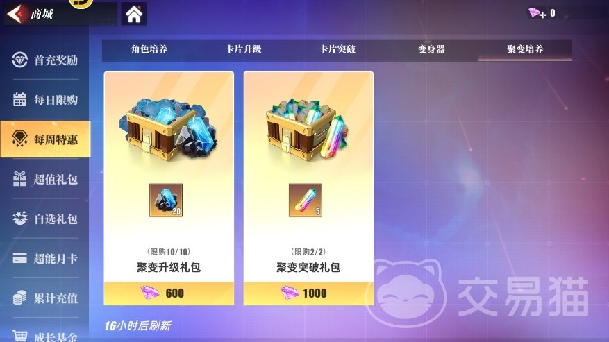 聚变培养:只有一个600光源之石的聚变升级礼包跟1000光源之石的聚变突破礼包,聚变升级礼包里面有20个原初光晶,每周限购10次,而聚变突破礼包里面只有5个升华光脉石,用来提升聚变共鸣等级,限购次数只有2次。