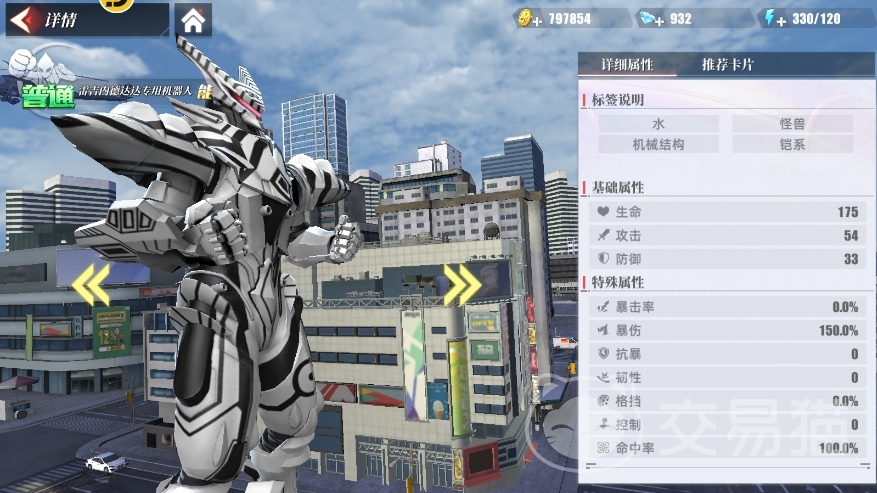 这是一个绿色品质也就是普通的角色,目前的详细属性中其实是属于机械结构的角色,这一点也跟它的名字很符合,从外形上面看也确实是一个非常不错的机器人,全身都是黑白两色交织的花纹,看起来很想斑马,亲水系,也是一个怪兽角色,属于铠系,基础属性当中攻击数值初始阶段只有54,不算很高,但是生命值比较高有175,这一点也证明了在铠系当中都是生存能力比较强的角色。
