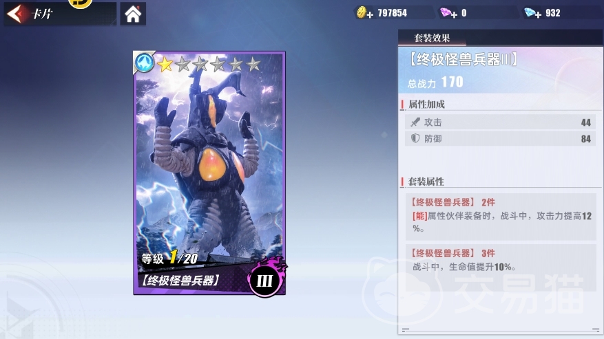 最后就是三级的终极怪兽兵器,在游戏中的总战力是170,带来的攻击提升44,而防御达到了84,卡片也是达到了紫色的卓越品质,但是总体效果其实这两套卡都是适用的,看大家如何选择吧。