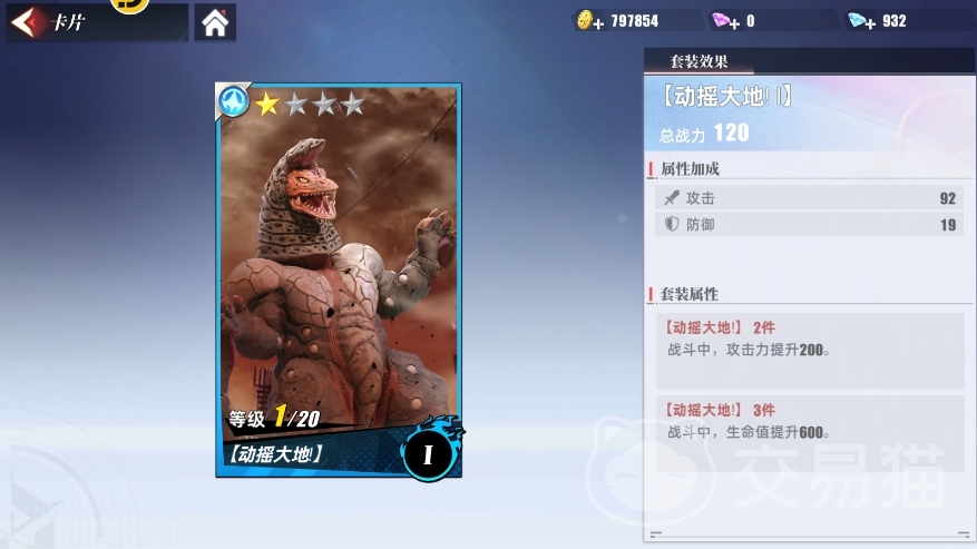 其次基础推荐的卡片是动摇大地,一级这个套装的效果是可以带来攻击提升92防御提升19的效果,套装属性在有两件上身的时候战斗中,攻击力提升200,上身三件的时候战斗中生命值会提升600,所以整体也是增加在了生命数值上。