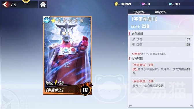 带来的数值会高很多,达到757这样的数值,最后的三级就是带来攻击加成57,防御加成108的效果,如果这样的三件套都上身的话带来的整体效果就是攻击、防御以及生命都很不错,而且这个宇宙拳法也是橙色品质的卡片,所以小编还是比较推荐下面这个进阶卡片的哦。