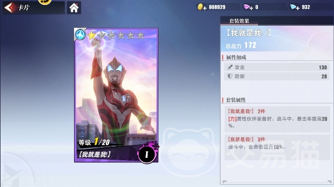 其次就是特殊属性上面也只有暴击以及命中,暴击有150,而命中是百分百,除此之外,其他的数值都是0,大家可以依照后期的培养来使用这个角色,推荐的卡片首先是基础类推荐,建议大家使用的是【我就是我】这个套装,在上面一级卡也是卓越品质的,使用这个套装在一开始就可以带来攻击以及防御的加成,攻击加成有138,而防御加成有28,数值还是不错的,在2件套同时装备的时候就可以带来历史性伙伴战斗中暴击提升20%的数值,这个数值后期也回随着卡片的等级提升而提升哦。