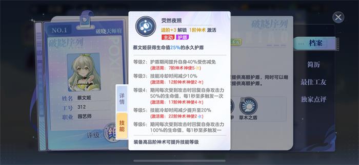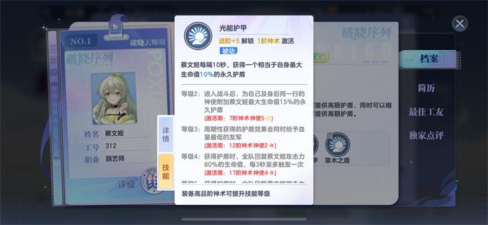最后一个技能是草木之盾,该技能是属性提升技能,可以将蔡文姬的攻击、生命以及防御属性都提升6%左右。蔡文姬主要是护盾重装,保护友军方面有很高的作用。它属于辅助型选手,大家在作战时可以将它作为全队增益的角色来看待,利用好蔡文姬的四个技能,可以为全队带来非常好的作战效果。