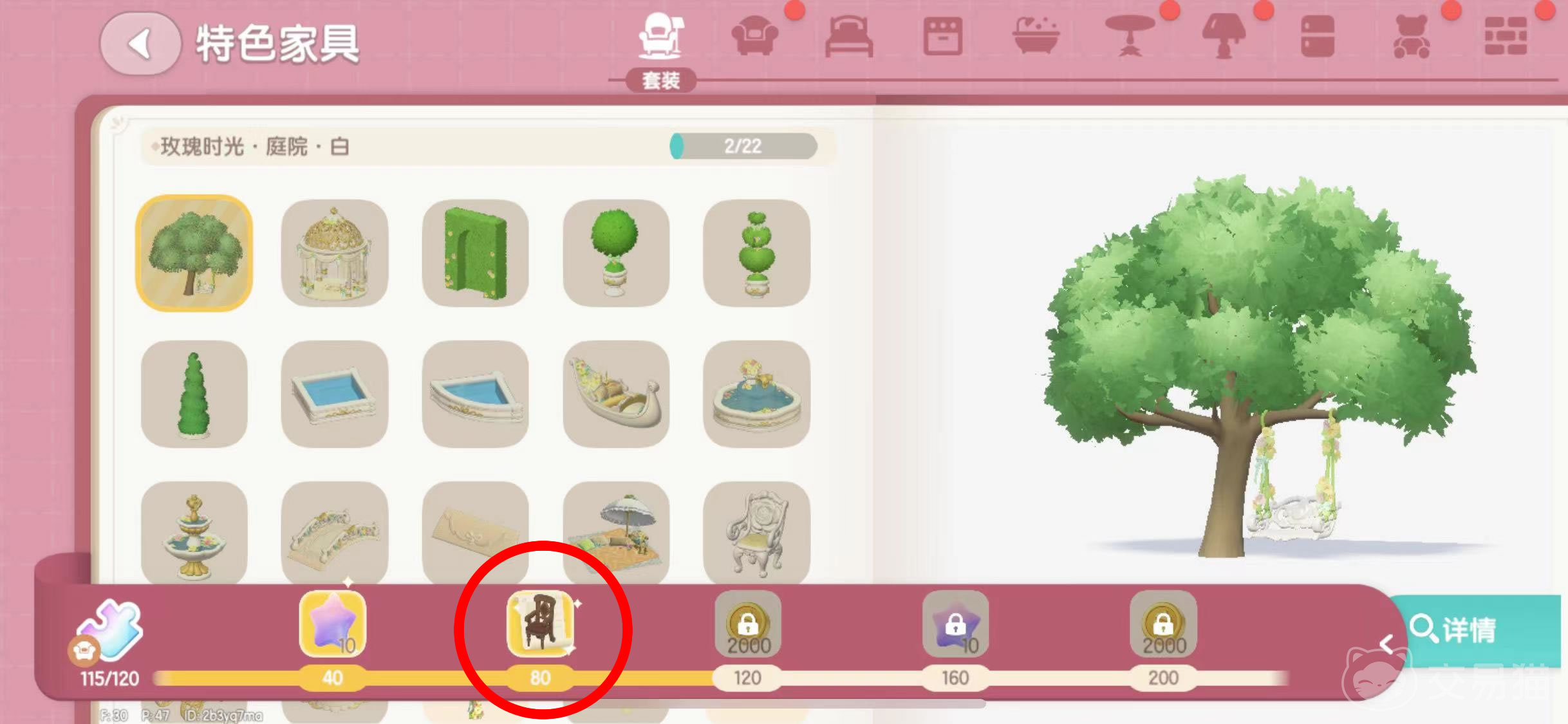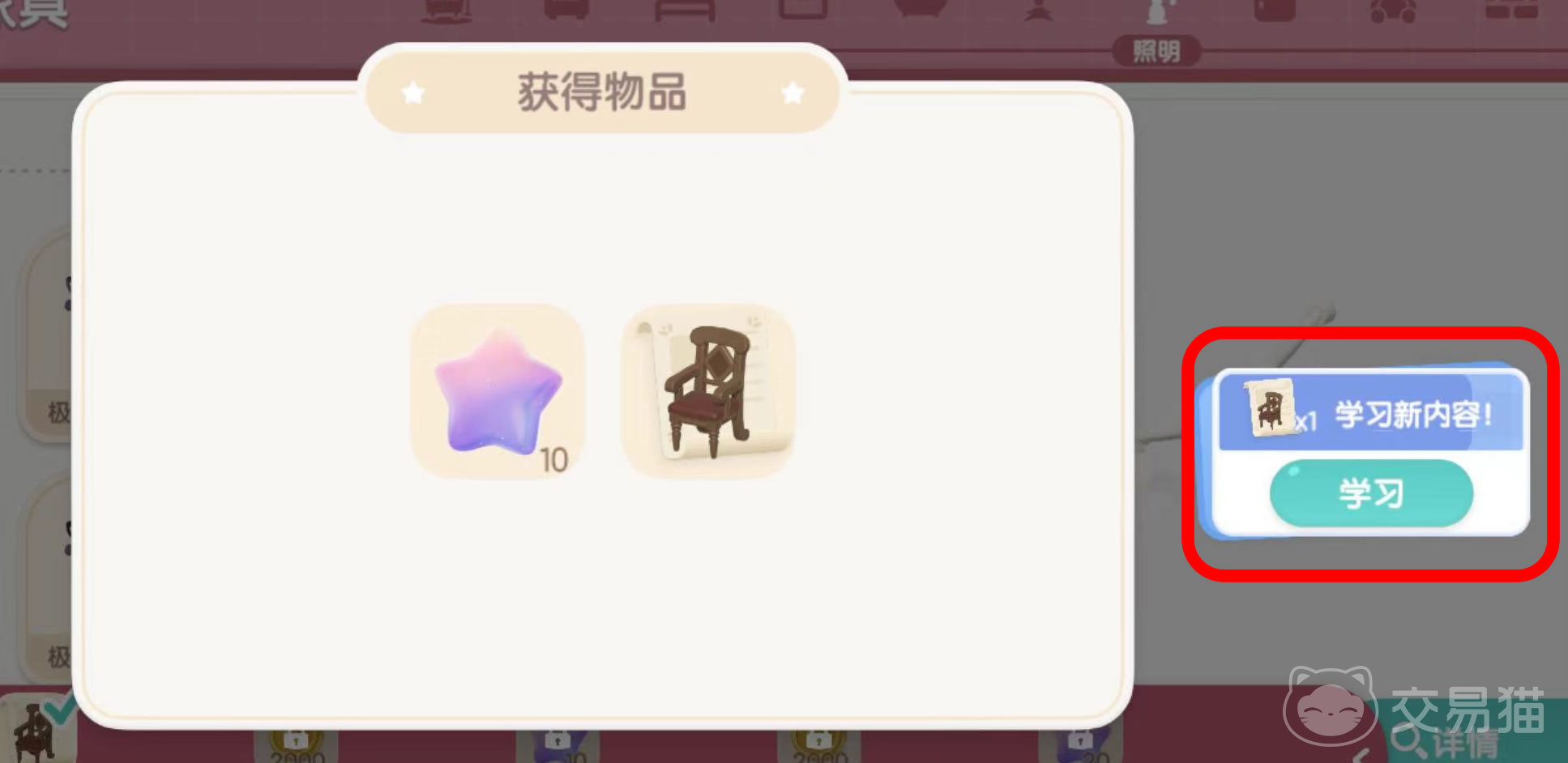 点击左侧特色家具栏目,最上方是细分出来的各种家具类别,比如套装、沙发座椅、床等等;中间是子分类中的详细内容;下方则是完成图鉴一定数量所能解锁的奖励。此时正好第二个奖励获得了一个“扶手椅”的制作图纸,点击即可领取。