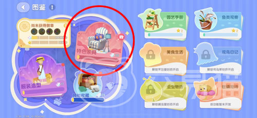 在图鉴中左侧按照大类型做了不同种类的划分,目前是三大类,分别为家具、服装和其他。右侧则是一些其他类型的分类,包含园艺手册、鱼类观察、美食生活、观鸟日记、虫虫物语等。分别对应了种植、钓鱼、烹饪、鸟类识别、捕虫等玩法解锁出来的图鉴。