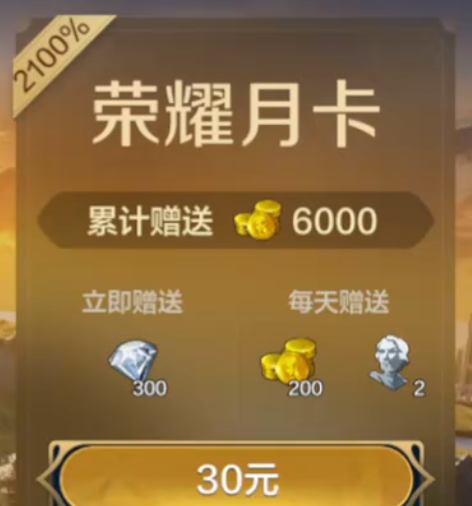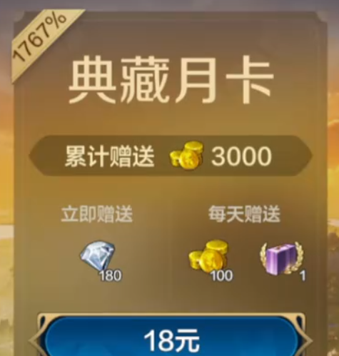 后续也不会出现比这个价格更低的月卡在月卡设计的方面,价格是非常值得的,并且获得的内容也比较丰富,有100的钻石以及100金币,荣耀月卡有300钻石和200的金币,金币都是每天可以赠送的,还是比较推荐大家购买典藏月卡进行使用,而荣耀月卡比较适合玩家们,想要获得伟人点数的进行购买。