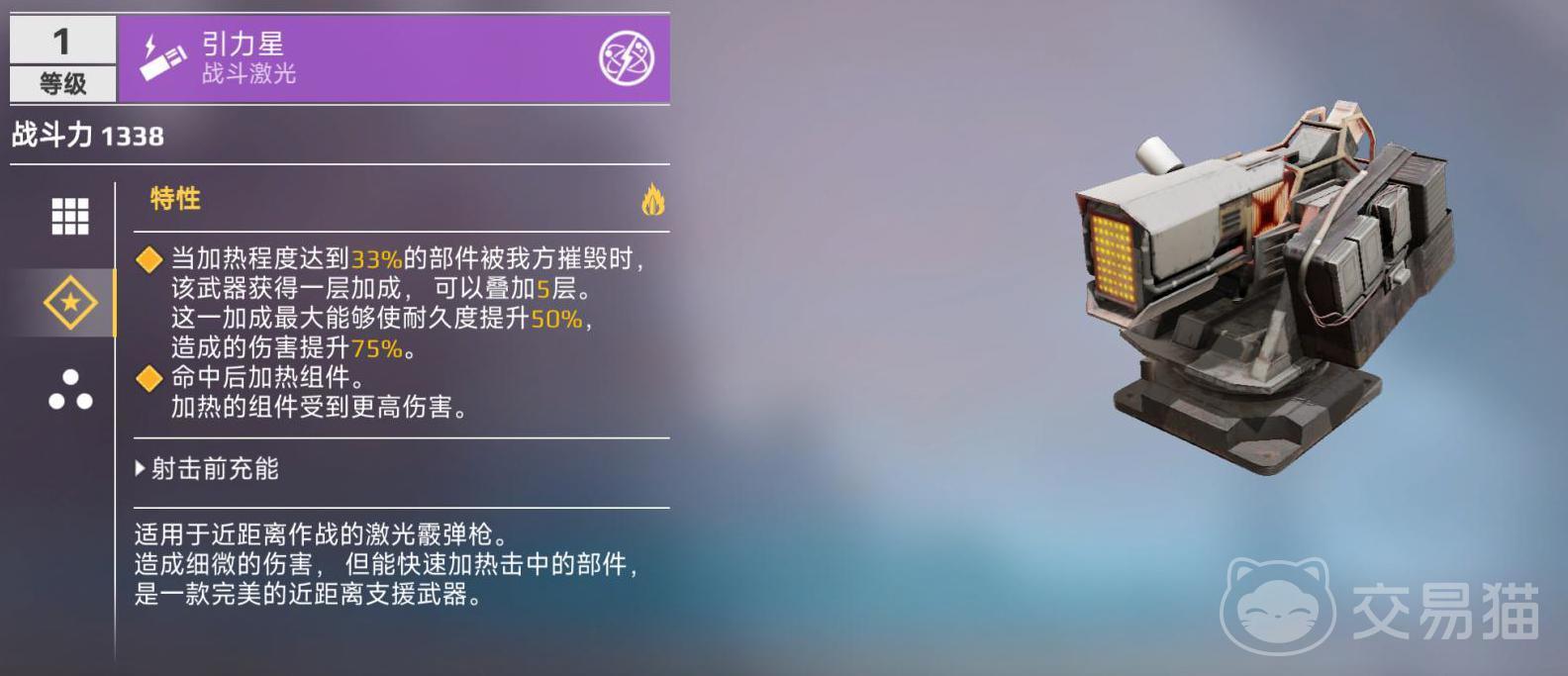 这款引力新的武器,是一款具有加热能力的激光武器,同时,他也具备了霰弹枪的特征,与其他类型的能量武器完全不同,可以造成1338的战斗能力,特别是和近距离来进行作战,可以很好的来支援其他的队友,对敌人造成细微的伤害。
