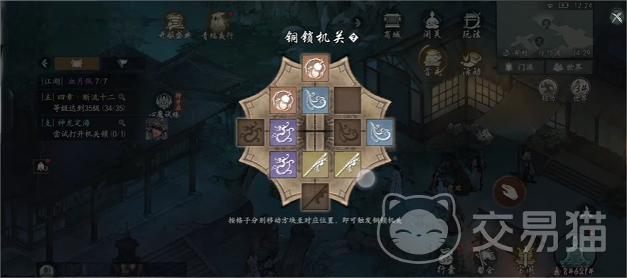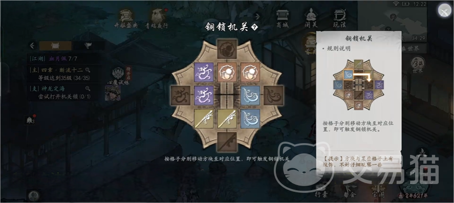 玩家在跟随着支线任务“神龙定海”不断推动剧情时,会面临着铜锁机关这一难题。通过观察玩家会发现,方块下的部分格子有着与方块相同的图案,玩家只需通过移动,将其移动到指定位置,便可以解开这一机关。