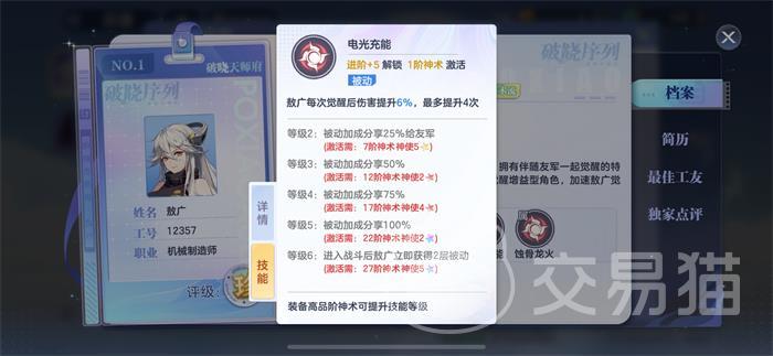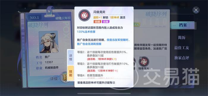 首先一技能是闪金龙炎,是觉醒技能,敖广释放该技能后,可以对周围圆形范围内的目标敌人造成120%的法术攻击伤害,并且敖敖广自身是无法进行觉醒的,但是当友军觉醒时,敖广就会无消耗的觉醒。二技能是主动技能熔炼霹雳,该技能释放后可以由敖广发射激光,对敌人命中造成220%的法术伤害,被动技能是电光充能,在敖广每次觉醒后可以为其提升6%的伤害,总共累计可以提升4次。该技能可以在队友的觉醒帮助下快速的激发出敖广的被动,很有利于团战情况。