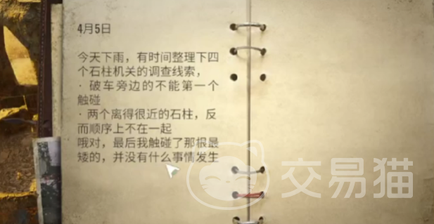 在刚进入游戏的初期,玩家想要解开这四根柱子的顺序和秘密游戏。给玩家相应的提示一个古老的日记笔记本。上面的日记就是玩家解锁石柱顺序的关键,玩家们可以根据日记上的指引来对石柱进行调整和解锁。