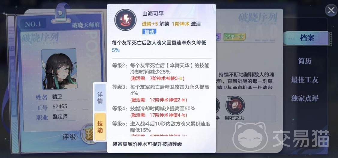 先来简单介绍下精卫的技能特点。精卫的觉醒技是个输出技能,可以操控机关伞对敌人进行多次伤害,并且还能削弱敌人的魂火回复速度。这个削弱是永久存在的。这个技能伤害很高,强化满以后,还能进一步提升技能伤害,十分强力。