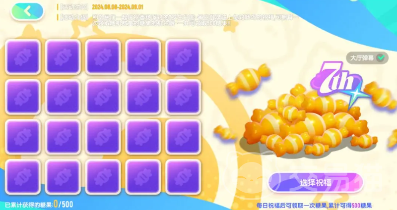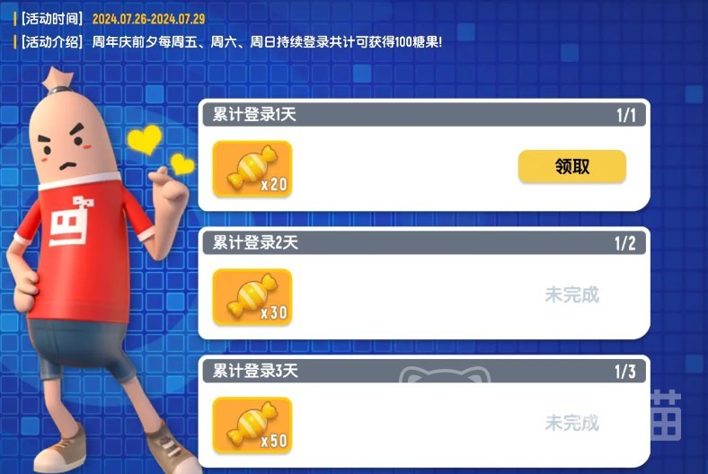 这次香肠派对七周年庆典会在2024年8月8日正式开启,这次活动分为三个阶段,第一弹会在7月26日开启,截止7月29日,累计签到3天就可以得到100糖果,算是一个开胃小菜。