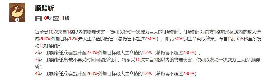 顺劈斩:每当布鲁特斯承受来自紧邻敌人的10次物理攻击,他便有能力启动一次威力强大的顺劈斩。该技能能够对正前方一格宽的弧形区域内的敌人造成等同于其200%攻击力以及额外12%最大生命值的伤害(整体伤害不会超过750%),并且带有30%的生命偷取效果。需要注意的是,布鲁特斯每5秒钟最多只可发动一次顺劈斩。