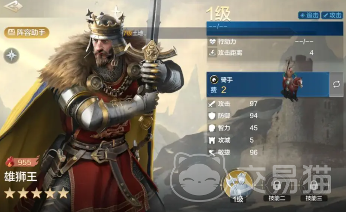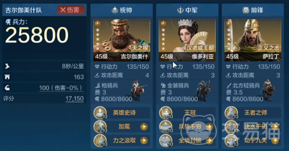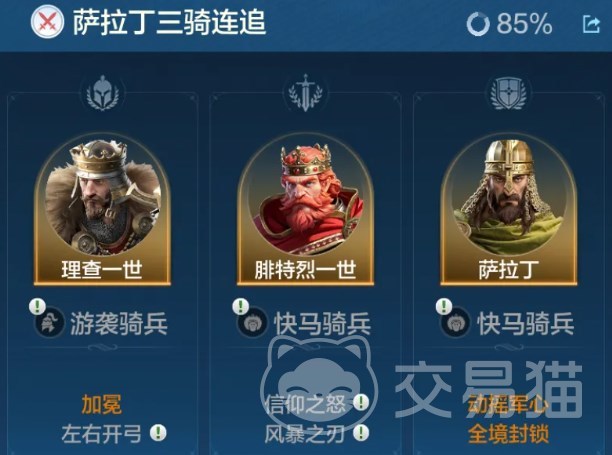 既然是狮王追击队,当然少不了雄狮“查理一世”,他的核心技能是普攻后给自己增伤,并再对目标造成一次伤害,稳定的追击手段。技能携带加冕和守护之剑,前者是前3回合加暴击而且每回合都有几率获得连击效果再进行一次额外普攻。后者是前4回合在前锋位置上获得霸体,并在受伤时候几率提升统率攻击、智力属性。萨拉丁的坦度不是很高,做先锋有一点吃力,刚好可以将查理一世摆放先锋位置上。兵种方面建议携带虎爪一代。